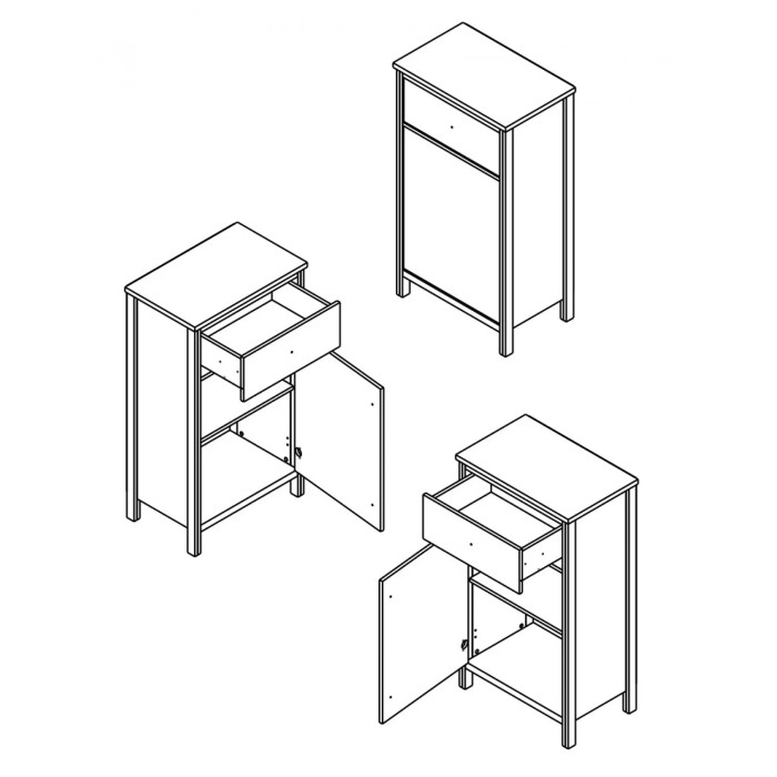 Ця модель чудово впишеться в інтер'єр кімнати, не займаючи багато місця. Вона прекрасно поєднує в собі функціональність і естетику сучасного дизайну. Обладнана однією дверкою і одним висувним ящиком на роликових направляючих GAMET (Польща), що забезпечує плавне і тихе відкриття і закриття. Всі деталі корпусу і фасаду надійно скріплені за допомогою навісних петель SAMET (Туреччина), що гарантують міцність і довговічність конструкції.