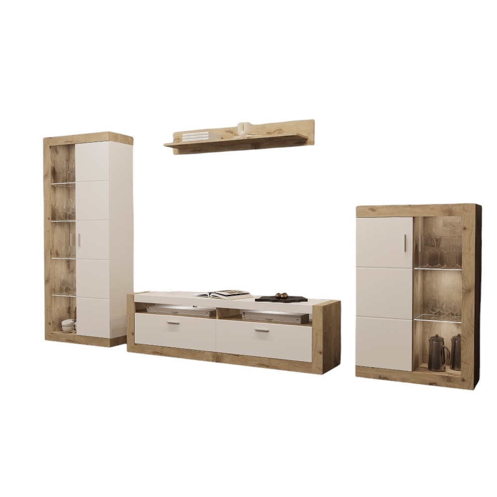 Дизайн комплекту відзначається сучасним стилем, що гармонійно поєднує текстури дерева, скла та фарби. Завдяки своєму функціоналу та естетиці, цей набір меблів ідеально впишеться у вашу вітальню, забезпечуючи комфорт і вишуканість.