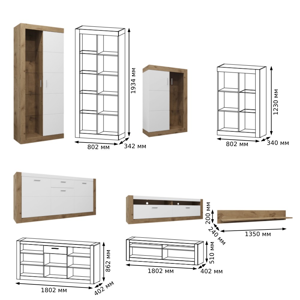Дизайн комплекту відзначається сучасним стилем, що гармонійно поєднує текстури дерева, скла та фарби. Завдяки своєму функціоналу та естетиці, цей набір меблів ідеально впишеться у вашу вітальню, забезпечуючи комфорт і вишуканість.