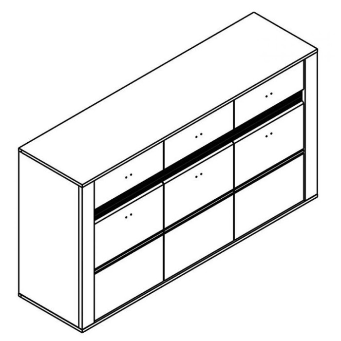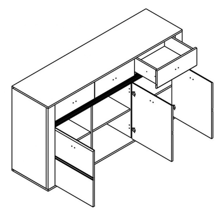 У складі комода - три висувних ящика та три двері, що дозволяє розміщувати всередині різні предмети та аксесуари. Для створення єдиного стилю оздоблення використано колір "Дуб ансберг темний". Фурнітура для комода вибрана з кращих світових колекцій: фірмові петлі FGV виготовлені в Італії, кулькові направляючі повного висування HAFELE з Німеччини та ручки з металу SIRO - виробництво Австрії.