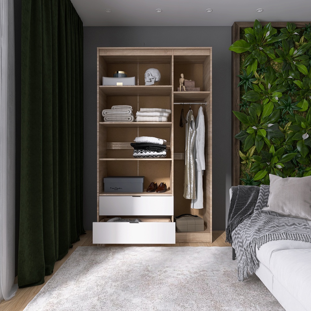 - Продумана система зберігання. Шафа розроблена з урахуванням потреб сучасного користувача. У її конструкції передбачено штангу для одягу, полиці та дві місткі висувні шухляди на телескопічних направляючих.