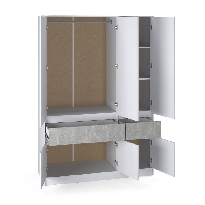 • Продумана система зберігання. Шафа розроблена з урахуванням потреб сучасного користувача. У її конструкції передбачено штангу для одягу, полиці, два місткі висувні ящики на телескопічних направляючих, а також дві нижні ніші для додаткового зберігання.