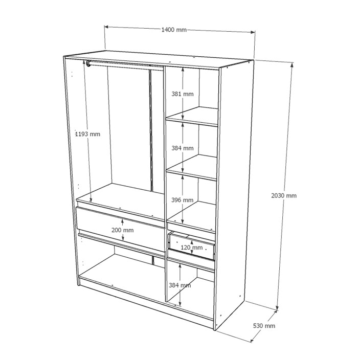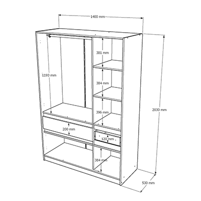 • Продумана система зберігання. Шафа розроблена з урахуванням потреб сучасного користувача. У її конструкції передбачено штангу для одягу, полиці, два місткі висувні ящики на телескопічних направляючих, а також дві нижні ніші для додаткового зберігання.