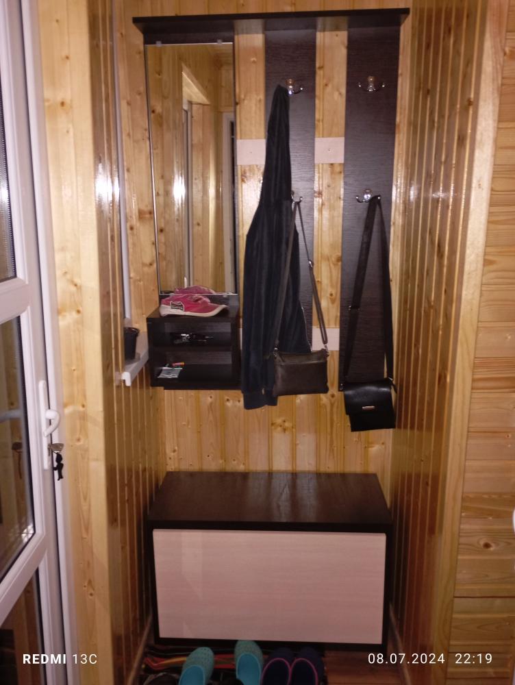 - Функціональна комплектація: передпокій оснащений тумбою для взуття на дві секції, дзеркалом, щитом з чотирма гачками і двома невеликими полицями для зберігання дрібниць і ключів.