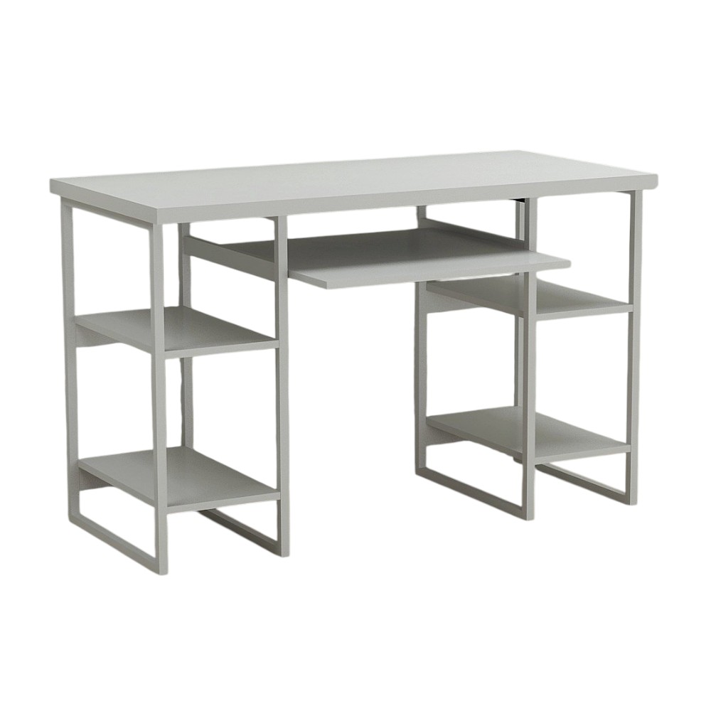 Каркас столу виконаний з металу, покритого порошковою фарбою, що забезпечує стійкість до подряпин та механічних пошкоджень. Стільниця доступна в двох варіантах товщини: 16 мм і 32 мм, що дозволяє вибрати оптимальний варіант залежно від потреб. Всі краї оброблені ПВХ-кромкою товщиною 2 мм, що захищає від пошкоджень і додає естетичний вигляд. Полиці виготовлені з ламінованого ДСП, що забезпечує високу зносостійкість і легкість у догляді. Висувна полиця для клавіатури оснащена телескопічними направляючими для плавного і безшумного руху.