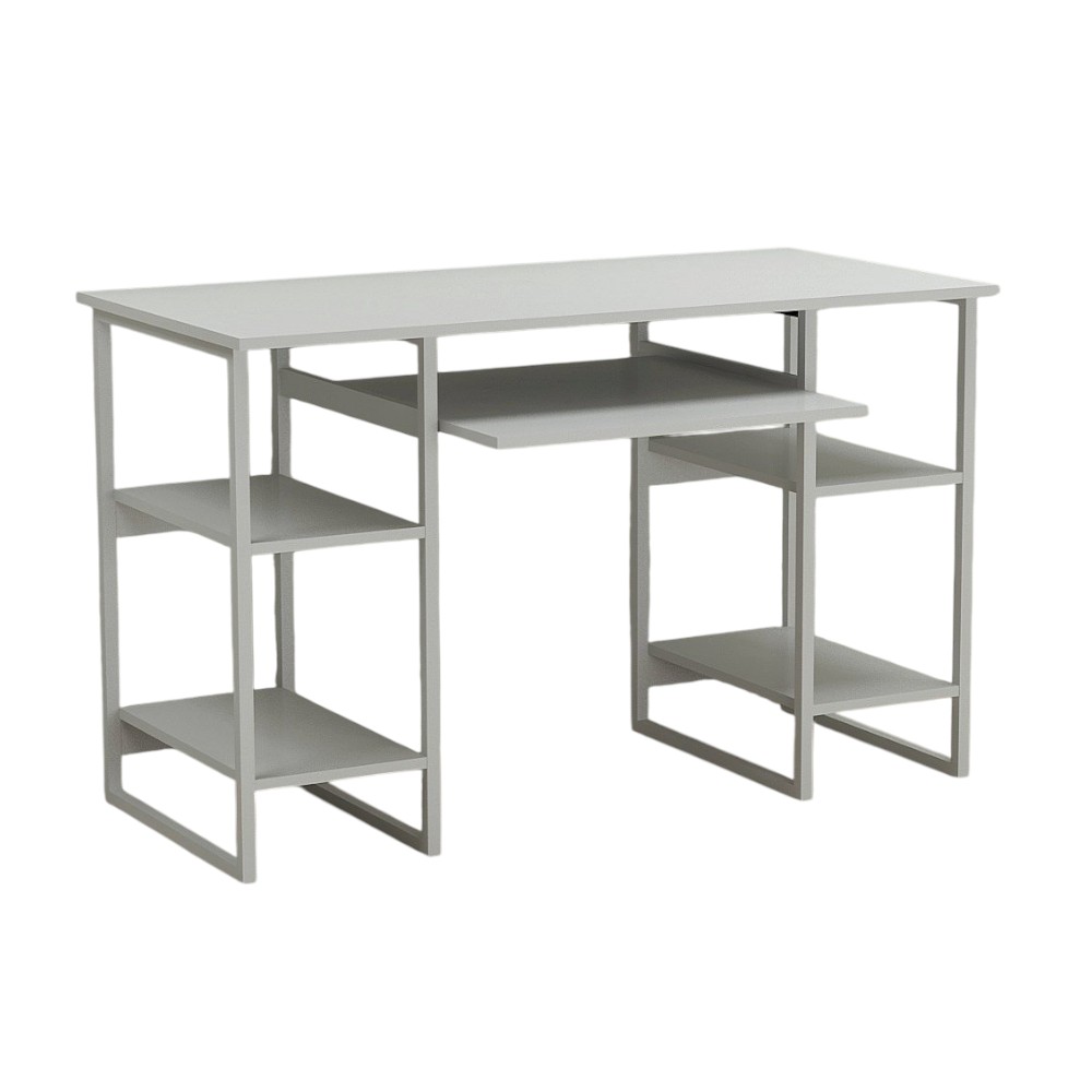 Каркас столу виконаний з металу, покритого порошковою фарбою, що забезпечує стійкість до подряпин та механічних пошкоджень. Стільниця доступна в двох варіантах товщини: 16 мм і 32 мм, що дозволяє вибрати оптимальний варіант залежно від потреб. Всі краї оброблені ПВХ-кромкою товщиною 2 мм, що захищає від пошкоджень і додає естетичний вигляд. Полиці виготовлені з ламінованого ДСП, що забезпечує високу зносостійкість і легкість у догляді. Висувна полиця для клавіатури оснащена телескопічними направляючими для плавного і безшумного руху.