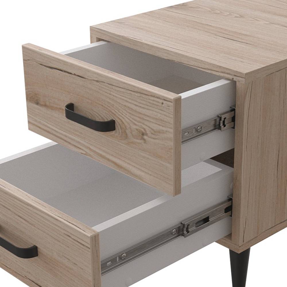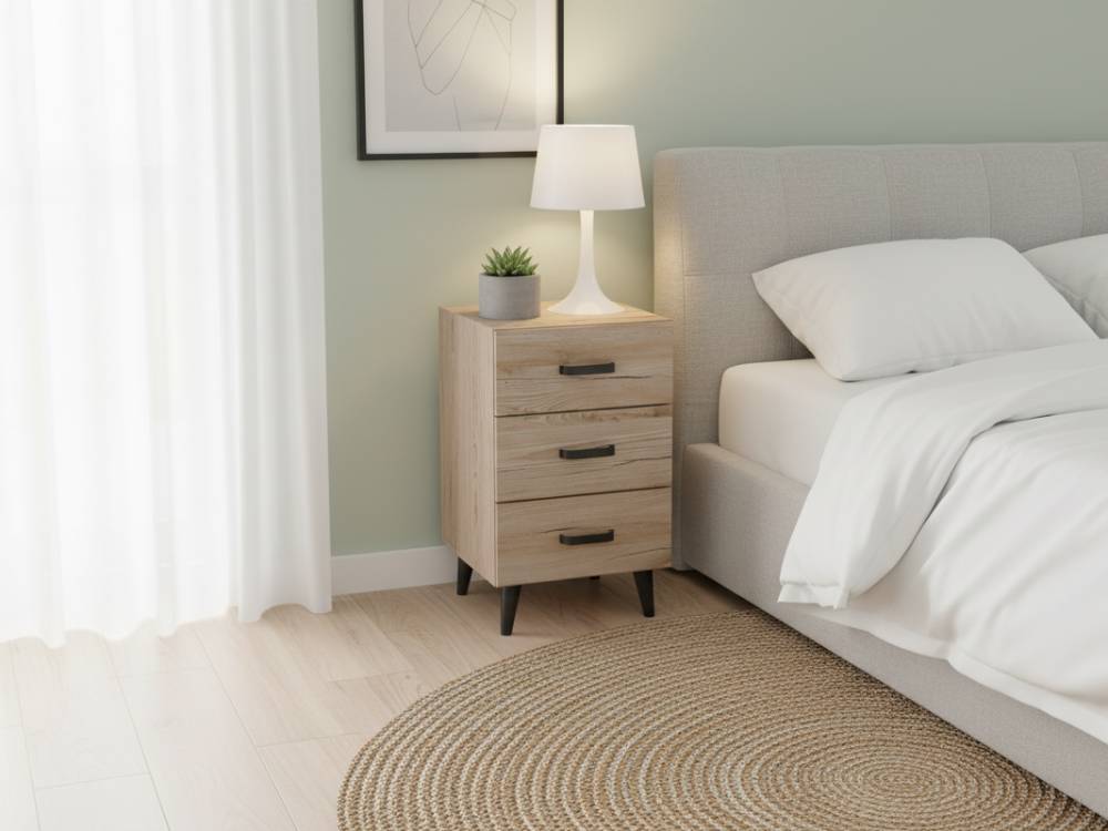 Корпус тумби виконаний із ламінованої ДСП товщиною 16 мм, стійкої до щоденного використання. Кромка ПВХ захищає деталі від зношування й надає виробу завершеного вигляду. Металеві конусні ніжки пофарбовані порошковою фарбою, що захищає їх від подряпин, вологи та механічних пошкоджень. Завдяки цьому конструкція міцна, довговічна та зручна у догляді.