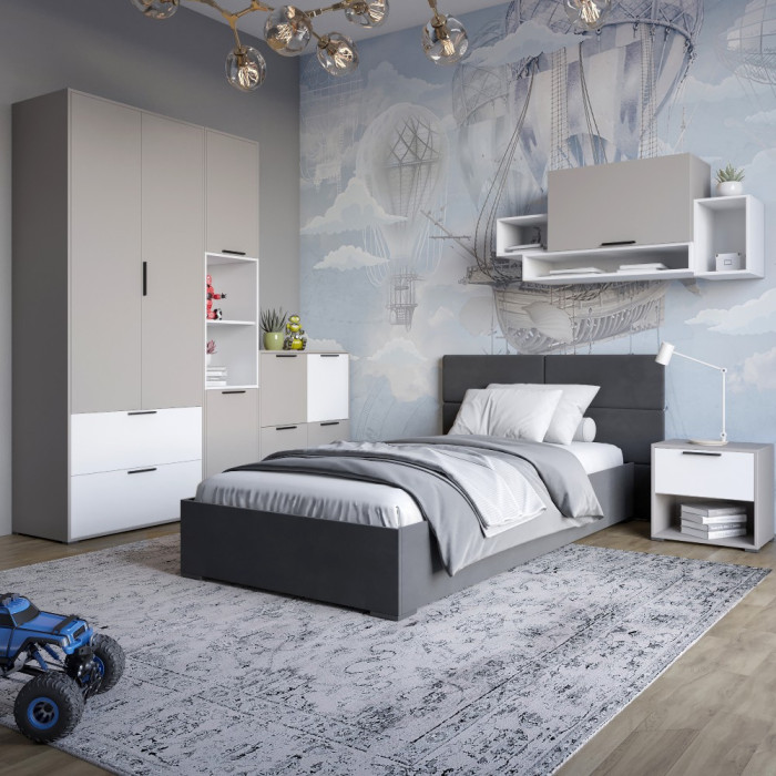 Гарнитур в спальню LION Краш из 6 элементов Коллекция мебели LION Краш - это стильное и функциональное решение для вашего интерьера. В нее входят: Кровать обита высококачественным велюром и укомплектована ламелями обеспечит комфортный отдых. Полка с одним закрытым отсеком - стильный и современный акцент коллекции. Закрытый пенал, который благодаря своим габаритам и закрытому дизайну идеально подходит для организации пространства. Прикроватная тумба — минималистина и идеальна для мелочей и необходимых аксессуаров. Двухдверный распашный шкаф — сочетание стильного дизайна и практичности для хранения вещей. Тумба четырехдверная — благодаря продуманной конструкции с просторными отделениями это идеальный вариант для хранения большого количества вещей. Материал изготовления Гарнитур изготовлен из ЛДСП SWISS KRONO — высококачественного материала, отличающегося прочностью, стойкостью к механическим повреждениям, влаге и высоким температурам. Это гарантирует долговечность мебели и ее привлекательный внешний вид. Обивка кровати выполнена из велюра Лили. Этот материал отличается мягкостью и приятной текстурой, что создает ощущение уюта и комфорта. Материал также отличается высокой износостойкостью, что обеспечивает его долговечность даже при интенсивном использовании. Особенности Телескопические направляющие на ящиках: обеспечивают плавный и полный доступ к содержимому ящиков, добавляя удобства в использовании. Продуманная емкость: каждый элемент комплекта имеет достаточно места для хранения, помогая эффективно организовать пространство. Современный дизайн: лаконичный стиль и универсальные цвета гармонично сочетаются с любым интерьером. Качественные материалы: изготовлен из ламинированного ДСП, комплект отличается долговечностью, прочностью и простотой в уходе. Размеры: Прикроватная тумба: Ширина: 450 мм Глубина: 320 мм Высота: 430 мм Кровать: Ширина: 1280 мм Глубина: 2140 мм Высота: 820 мм Полка с закрытым отсеком: Ширина: 1250 мм Глубина: 350 мм Высота: 540 мм Пенал закрыт с 2 дверцами: Ширина: 400 мм Глубина: 430 мм Высота: 2000 мм Шкаф распашный двухдверный с ящиками: Ширина: 800 мм Глубина: 520 мм Высота: 2000 мм Тумба четырехдверная: Ширина: 820 мм Глубина: 430 мм Высота: 860 мм