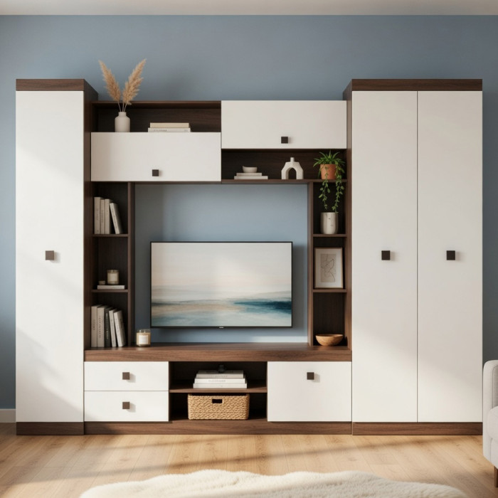 - Центральна стінка з функціональним наповненням – включає тумбу під телевізор, дві висувні шухляди та комбінацію відкритих полиць.