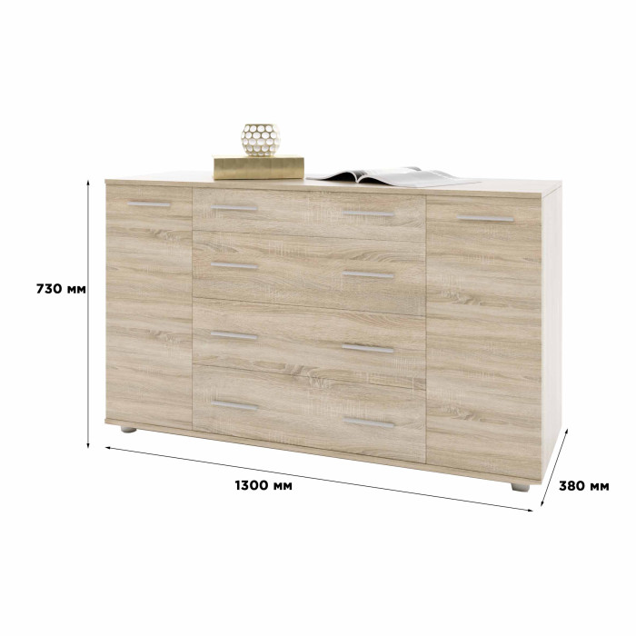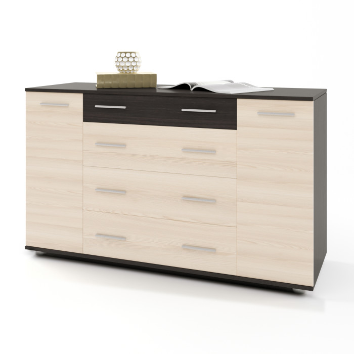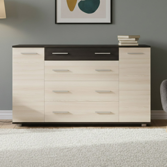 Корпус і фасади комода виготовлені з ламінованої деревно-стружкової плити (ЛДСП) класу емісії Е1. Матеріал відрізняється міцністю, стійкістю до стирання і безпекою для використання в житлових приміщеннях. Торці деталей оброблені захисною ПВХ-кромкою, яка захищає меблі від механічних пошкоджень і продовжує термін їх експлуатації.