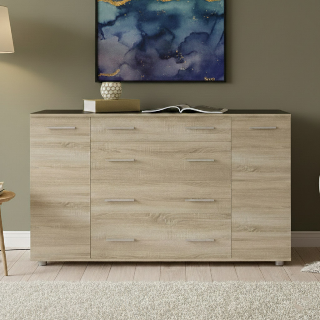 Комод для спальні Еверест К-4 — практичний і місткий елемент корпусних меблів, призначений для зручного зберігання одягу, білизни та інших повсякденних речей. Модель поєднує в собі продуману систему зберігання і універсальний дизайн, завдяки чому підходить для спальні, вітальні, передпокою або дитячої кімнати. Конструкція включає чотири висувні ящики і закриті відділення з орними дверцятами, що дозволяє раціонально організувати простір.