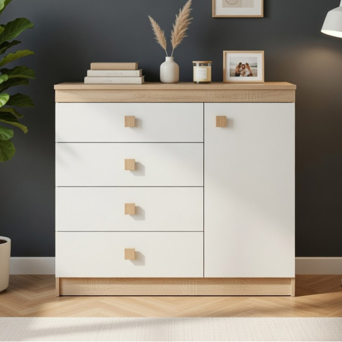 Комод Соната-5 — практичний та місткий елемент меблів із колекції Соната від фабрики Еверест. Модель поєднує чотири висувні шухляди та відділення з відкидними дверцятами, що дозволяє зручно організувати зберігання одягу, білизни, аксесуарів і різних побутових речей. Завдяки стриманому дизайну та стандартним розмірам комод гармонійно впишеться в спальню, вітальню, коридор або дитячу кімнату.