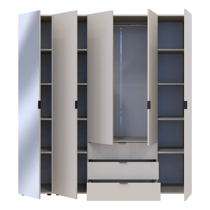 Комплект меблів для зберігання одягу Doros Гелар — це стильне та функціональне рішення для сучасного інтер’єру. Він складається з розпашної шафи зі штангою для вішаків, місткими шухлядами та зручними полицями, що дозволяють впорядкувати як верхній одяг, так і складені речі чи аксесуари. Доповнює її пенал з дзеркальним фасадом і полицями, що забезпечує зручну організацію складених речей, текстилю чи аксесуарів. Дзеркало на фасаді візуально розширює простір та додає інтер’єру легкості. Разом ці елементи утворюють функціональний і стильний комплект, який стане вдалим рішенням для спальні, гардеробної або передпокою.