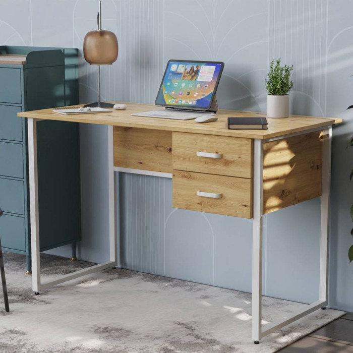 Письмовий стіл Ferrum-decor Дакота — це поєднання функціональності, ергономіки та сучасного дизайну. Завдяки двом зручним шухлядам він забезпечує достатньо місця для зберігання документів, канцелярії та особистих речей, зберігаючи при цьому порядок на робочій поверхні. Лаконічна форма та поєднання металевого каркасу з дерев’яними елементами надають столу стильного вигляду, який ідеально впишеться у сучасний інтер’єр кабінету, офісу чи домашнього робочого місця.