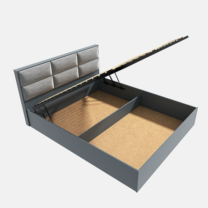 • Основною особливістю цієї моделі є підйомний механізм з ламельним каркасом. Він дає змогу легко підняти верхню частину ліжка, створюючи доступний простір для зберігання різних речей під ним. Це особливо зручно в разі обмеженого простору, оскільки ви можете використовувати внутрішній об'єм ліжка для зберігання постільної білизни, одягу або інших предметів.