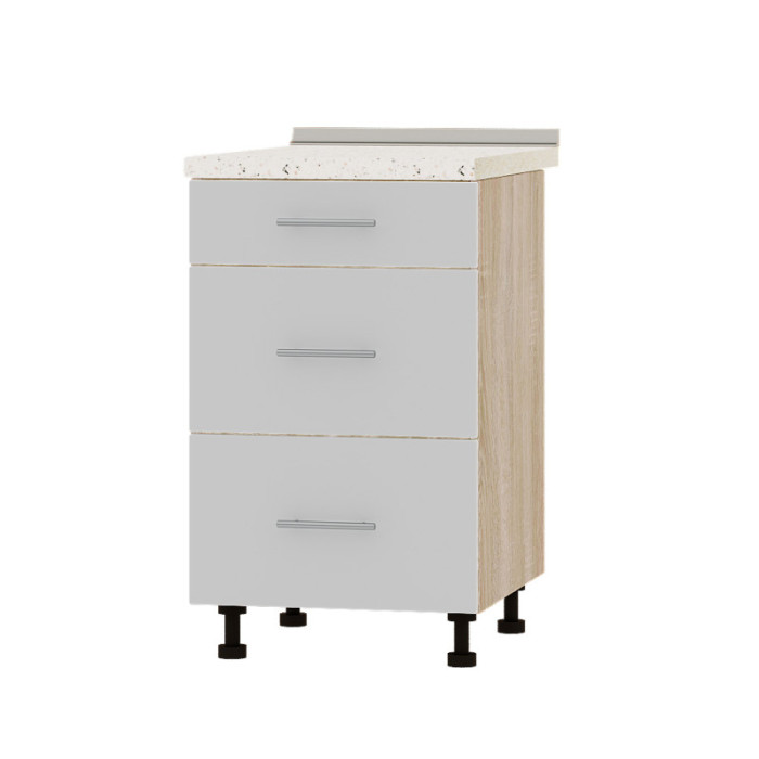 Модуль оснащений трьома висувними ящиками на телескопічних направляючих, які забезпечують плавне та безшумне відкривання. Виготовлений із якісного ламінованого ДСП товщиною 16 мм із обробкою фасадів кромкою АБС (1 мм), модуль поставляється без стільниці, що дозволяє вибрати її окремо за кольором і матеріалом відповідно до дизайну вашої кухні.