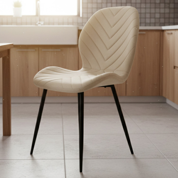 Стілець PM-006 від Perfect Home — це сучасне, зручне та естетичне рішення для спальні, кухні, їдальні або залу. М’яка велюрова оббивка бежевого кольору надає виробу вишуканого вигляду, створює атмосферу затишку та легко поєднується з різними інтер’єрними стилями, зокрема сучасним і лофт. Міцний металевий каркас із чорним порошковим покриттям забезпечує високу надійність, стійкість і тривалий термін служби. Прямі ніжки гарантують стабільність конструкції, а ергономічна форма сидіння та зручна пряма спинка забезпечують комфортну посадку навіть під час тривалого використання.