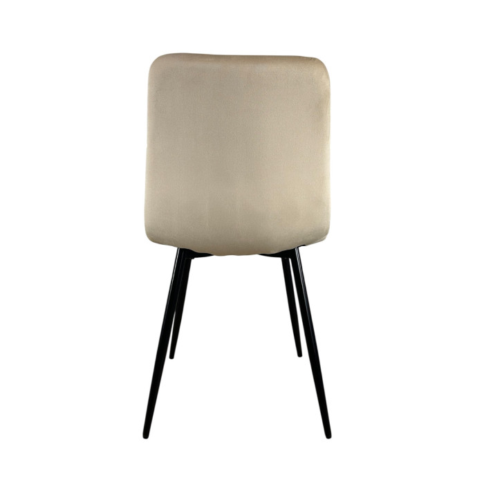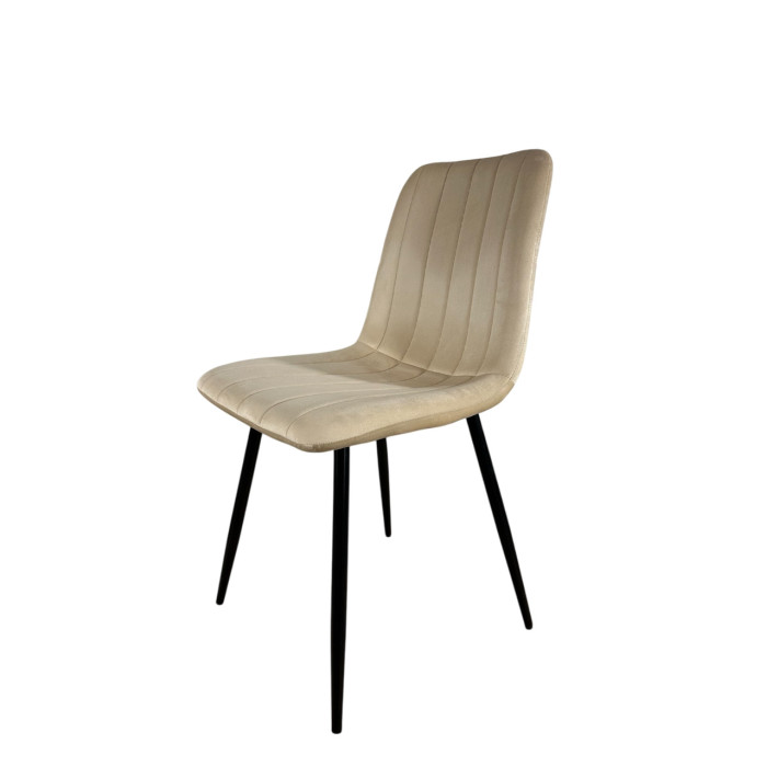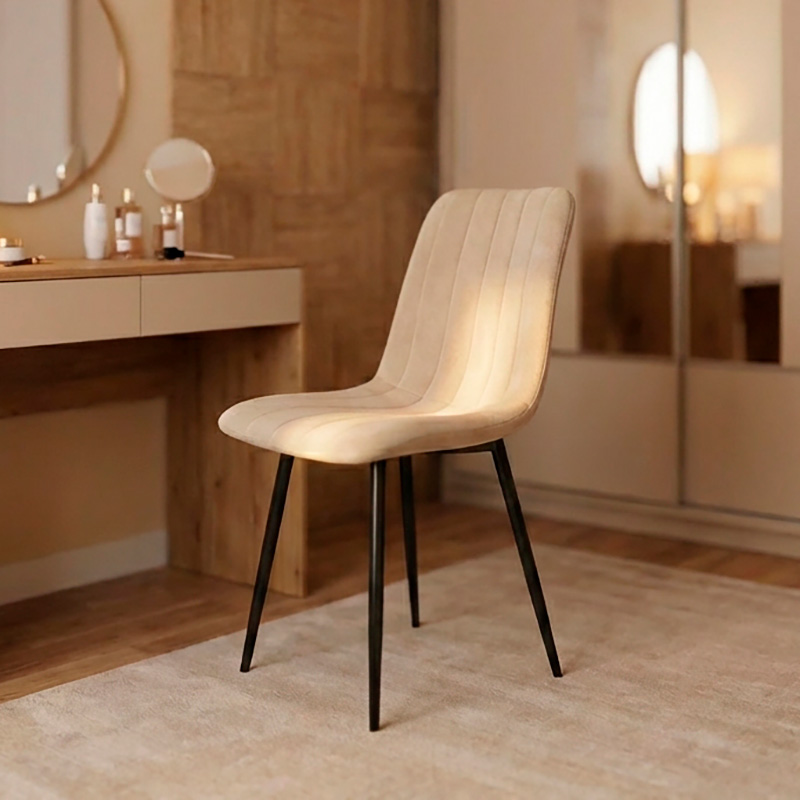 Стілець PM-005 від Perfect Home — це стильне та функціональне рішення для кухні, їдальні, спальні або залу. Завдяки елегантній велюровій оббивці бежевого кольору стілець створює атмосферу тепла й затишку та легко вписується в сучасні інтер’єри й простори у стилі лофт. Лаконічний дизайн підкреслює стриману естетику меблів і гармонійно поєднується з різними дизайнерськими рішеннями. Міцний металевий каркас із чорним порошковим покриттям забезпечує надійність, стійкість і довговічність у щоденному використанні. Прямі ніжки гарантують стабільність, а зручна пряма спинка та м’яке сидіння з приємної на дотик велюрової тканини дарують комфорт навіть під час тривалого сидіння.