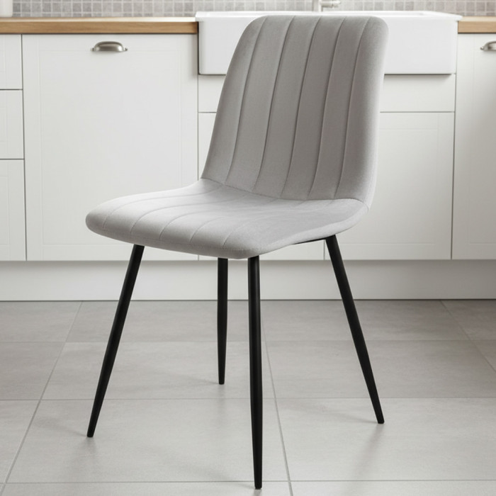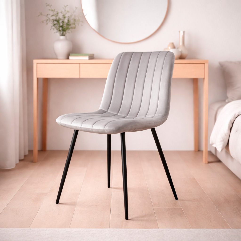 Стілець PM-005 від Perfect Home — це стильне та функціональне рішення для спальні, кухні, їдальні або залу. Завдяки елегантній велюровій оббивці сірого кольору стілець створює атмосферу тепла й затишку та легко вписується в сучасні інтер’єри й простори у стилі лофт. Лаконічний дизайн підкреслює стриману естетику меблів і гармонійно поєднується з різними дизайнерськими рішеннями. Міцний металевий каркас із чорним порошковим покриттям забезпечує надійність, стійкість і довговічність у щоденному використанні. Прямі ніжки гарантують стабільність, а зручна пряма спинка та м’яке сидіння з приємної на дотик велюрової тканини дарують комфорт навіть під час тривалого сидіння.