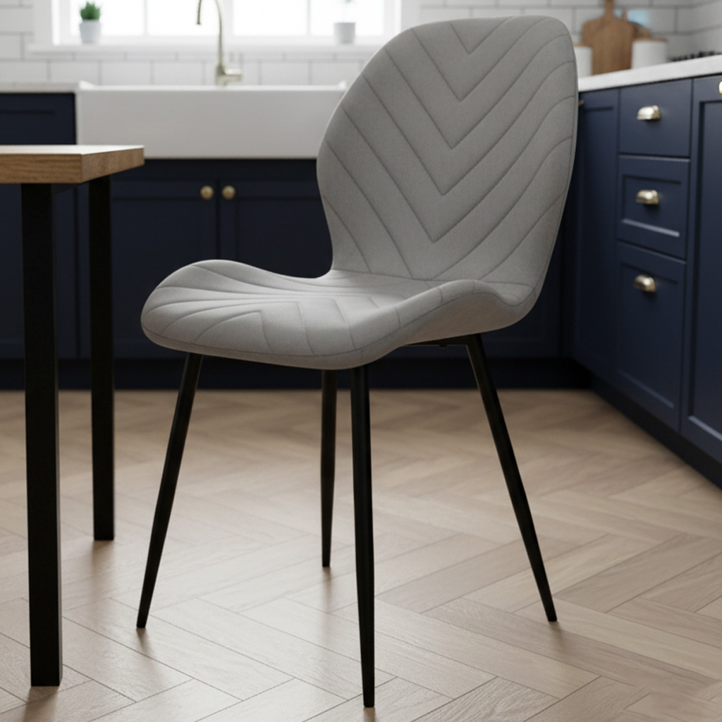 Стілець PM-006 від Perfect Home — це сучасне, зручне та естетичне рішення для спальні, кухні, їдальні або залу. М’яка велюрова оббивка сірого кольору надає виробу вишуканого вигляду, створює атмосферу затишку та легко поєднується з різними інтер’єрними стилями, зокрема сучасним і лофт. Міцний металевий каркас із чорним порошковим покриттям забезпечує високу надійність, стійкість і тривалий термін служби. Прямі ніжки гарантують стабільність конструкції, а ергономічна форма сидіння та зручна пряма спинка забезпечують комфортну посадку навіть під час тривалого використання.