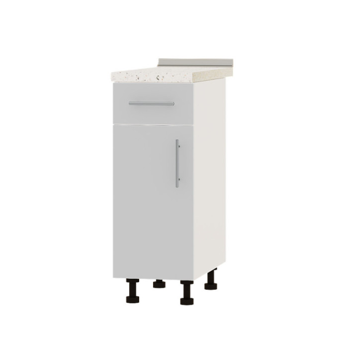 Модуль оснащений однією дверцятою з полицею для зберігання та висувною шухлядою на телескопічних направляючих, що забезпечує зручний доступ до вмісту. Виготовлений із якісного ламінованого ДСП товщиною 16 мм із кромкою АБС, він гарантує міцність і довговічність навіть при щоденному використанні.