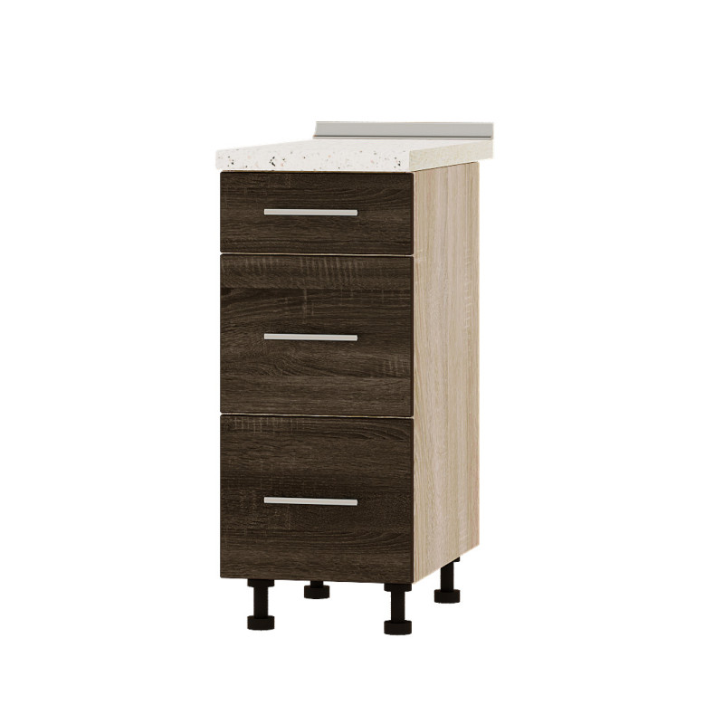 Модуль оснащений трьома висувними ящиками на телескопічних направляючих, які забезпечують плавне та безшумне відкривання. Виготовлений із якісного ламінованого ДСП товщиною 16 мм із обробкою фасадів кромкою АБС (1 мм), модуль поставляється без стільниці, що дозволяє вибрати її окремо за кольором і матеріалом відповідно до дизайну вашої кухні.