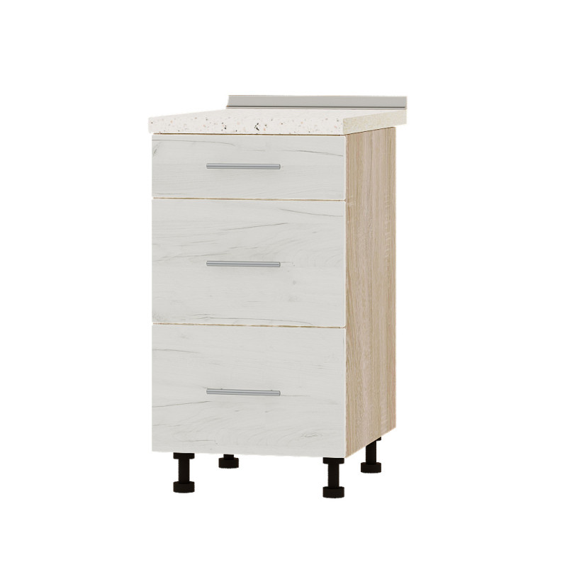 Модуль оснащений трьома висувними ящиками на телескопічних направляючих, які забезпечують плавне та безшумне відкривання. Виготовлений із якісного ламінованого ДСП товщиною 16 мм із обробкою фасадів кромкою АБС (1 мм), модуль поставляється без стільниці, що дозволяє вибрати її окремо за кольором і матеріалом відповідно до дизайну вашої кухні.