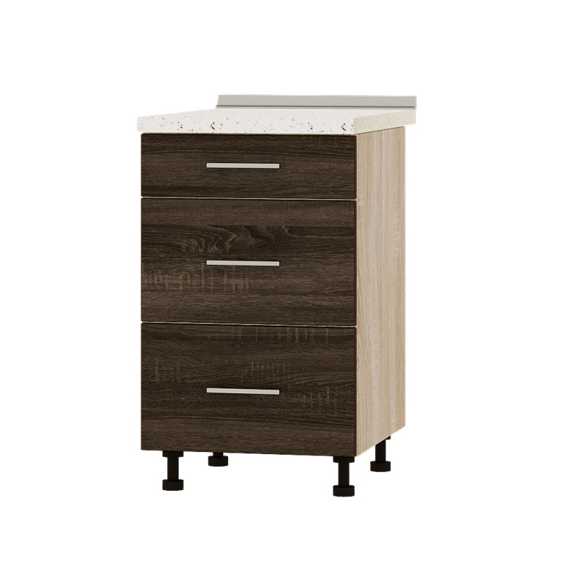 Модуль оснащений трьома висувними ящиками на телескопічних направляючих, які забезпечують плавне та безшумне відкривання. Виготовлений із якісного ламінованого ДСП товщиною 16 мм із обробкою фасадів кромкою АБС (1 мм), модуль поставляється без стільниці, що дозволяє вибрати її окремо за кольором і матеріалом відповідно до дизайну вашої кухні.