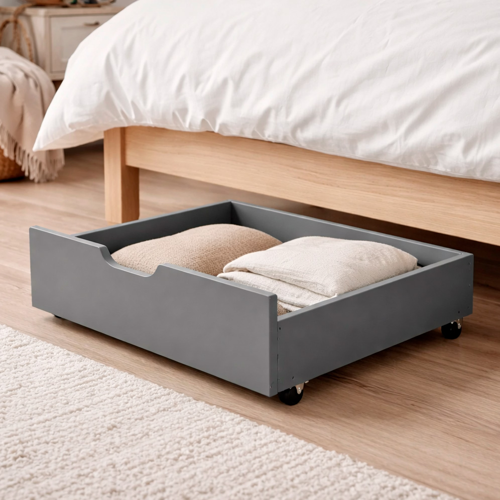 Шухляди для ліжка на коліщатках — це зручне та практичне рішення для додаткового зберігання без перевантаження простору. Вони легко висуваються та засуваються, забезпечуючи швидкий доступ до постільної білизни, одягу чи сезонних речей. Коліщатка не пошкоджують підлогу та роблять ящики зручними для щоденного використання, допомагаючи підтримувати порядок у спальні.