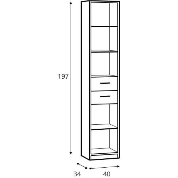 Розміри стелажа складають: ширина - 40 см, висота - 197 см, глибина - 34 см. Він включає в себе два висувних ящика і три відкриті полиці, що дозволяє розмістити на ньому велику кількість різних предметів, від книг до колекційних сувенірів.