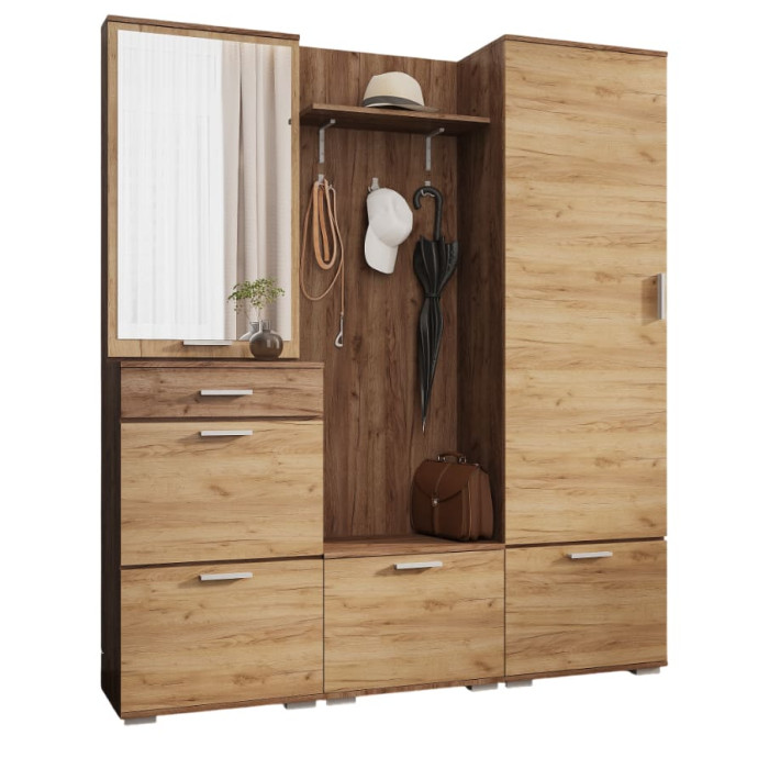 • Практичність: у комплект входять просторі тумби для взуття, шафа для верхнього одягу та аксесуарів, а також вішалка з полицею для головних уборів і парасоль. Все продумано для зручності зберігання.