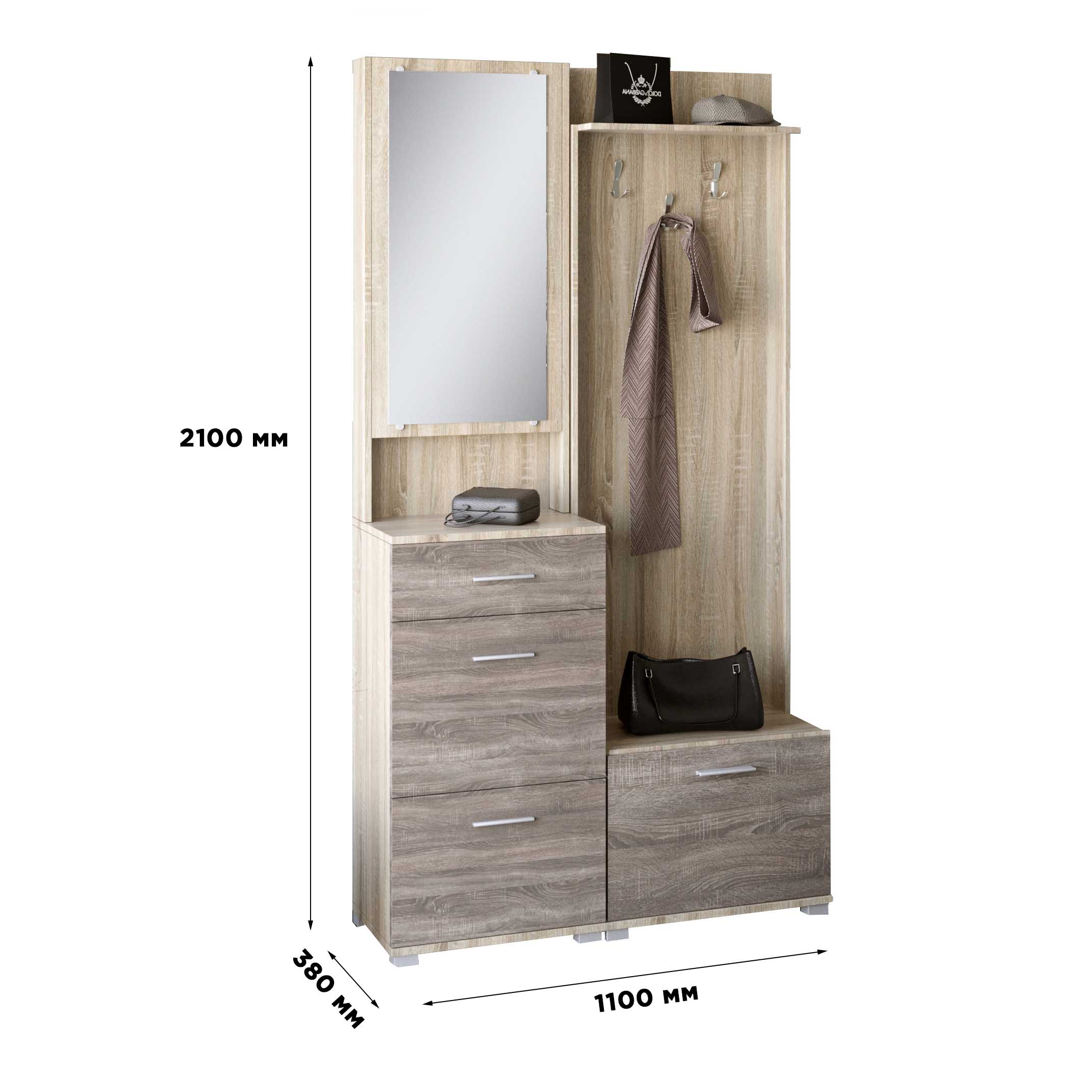 • Компактність і місткість: продумана конструкція робить комплект ідеальним рішенням для невеликих передпокоїв, забезпечуючи максимум зберігання при мінімальній займаній площі.