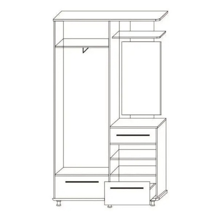 Конструкція включає високу шафу для зберігання одягу та аксесуарів, зручну відкриту вішалку з міцними гачками, компактний висувний ящик для дрібниць і верхню полицю для головних уборів або декору. Дзеркальна панель дозволяє швидко оцінити образ перед виходом і візуально збільшує простір. Шафа встановлюється виключно зліва від дзеркала, що є обов'язковою умовою збірки.