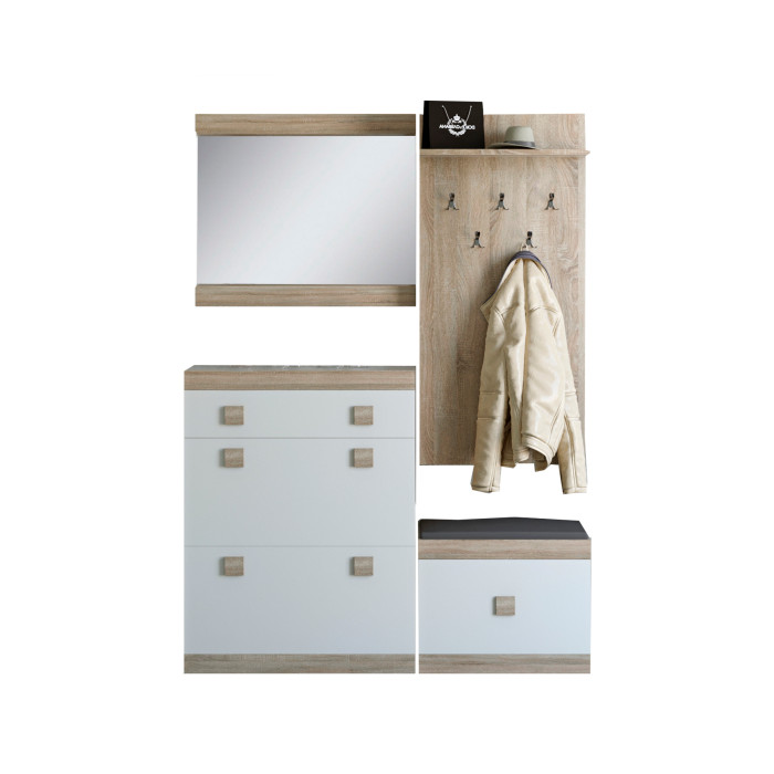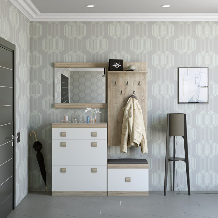 Міцна та надійна конструкція включає в себе взуттєву тумбу з двома відкидними дверцятами знизу і одним висувним ящиком, невелику тумбу для взуття з м'яким сидінням, вішалку для верхнього одягу і настінне дзеркало. Матеріал для виробу вибраний ЛДСП.