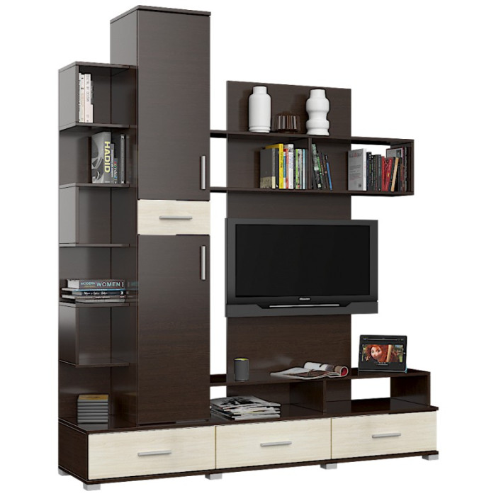 • Функциональная ТВ-зона. Основная стенка оснащена нишей под телевизор и системой открытых и закрытых полок, что позволяет удобно разместить технику, мультимедийные устройства и элементы декора.