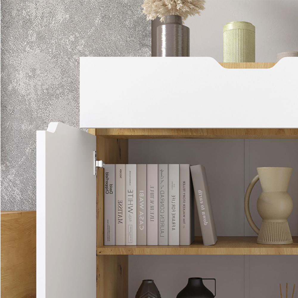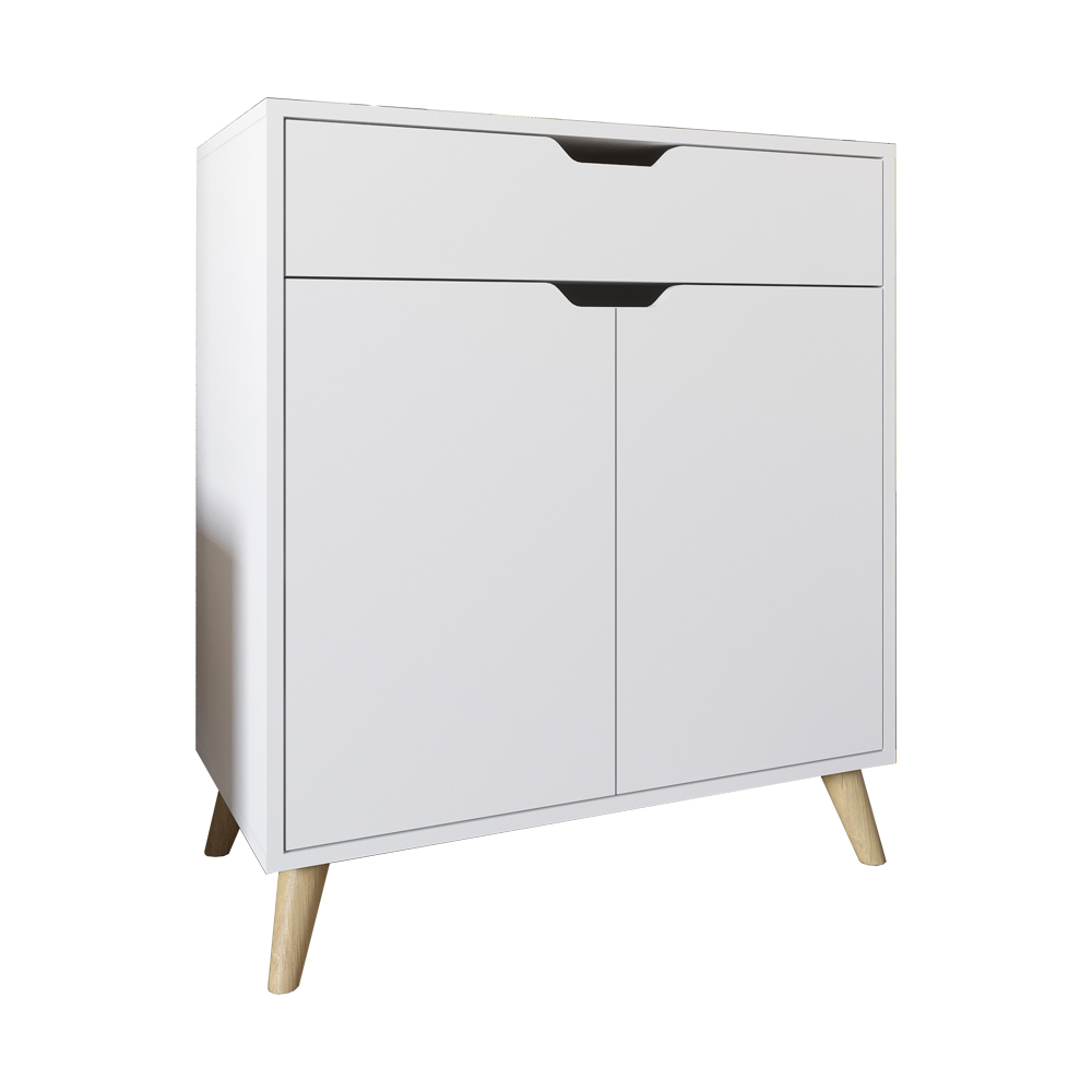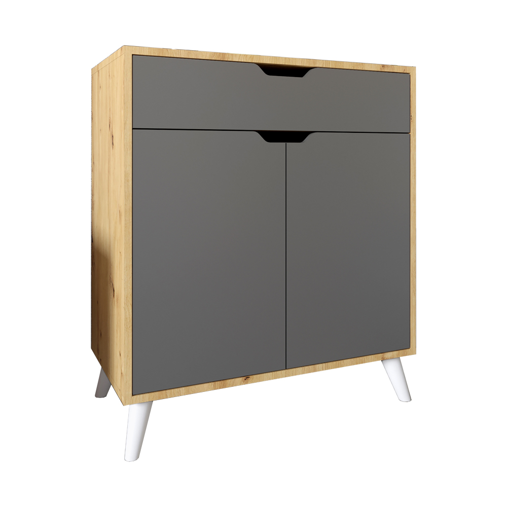 - Функциональное решение: Комод имеет выдвижной ящик для мелочей и аксессуаров, а также две полки с дверцами для хранения более габаритных вещей.