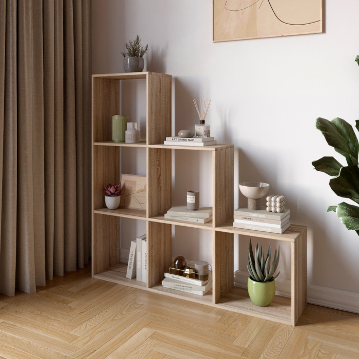 • Компактность: Благодаря своим размерам стеллаж не занимает много места, но обеспечивает большое количество пространства для хранения. Идеально подходит для компактных комнат или углов, которые нужно функционально использовать.