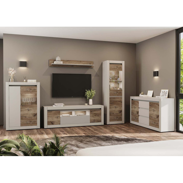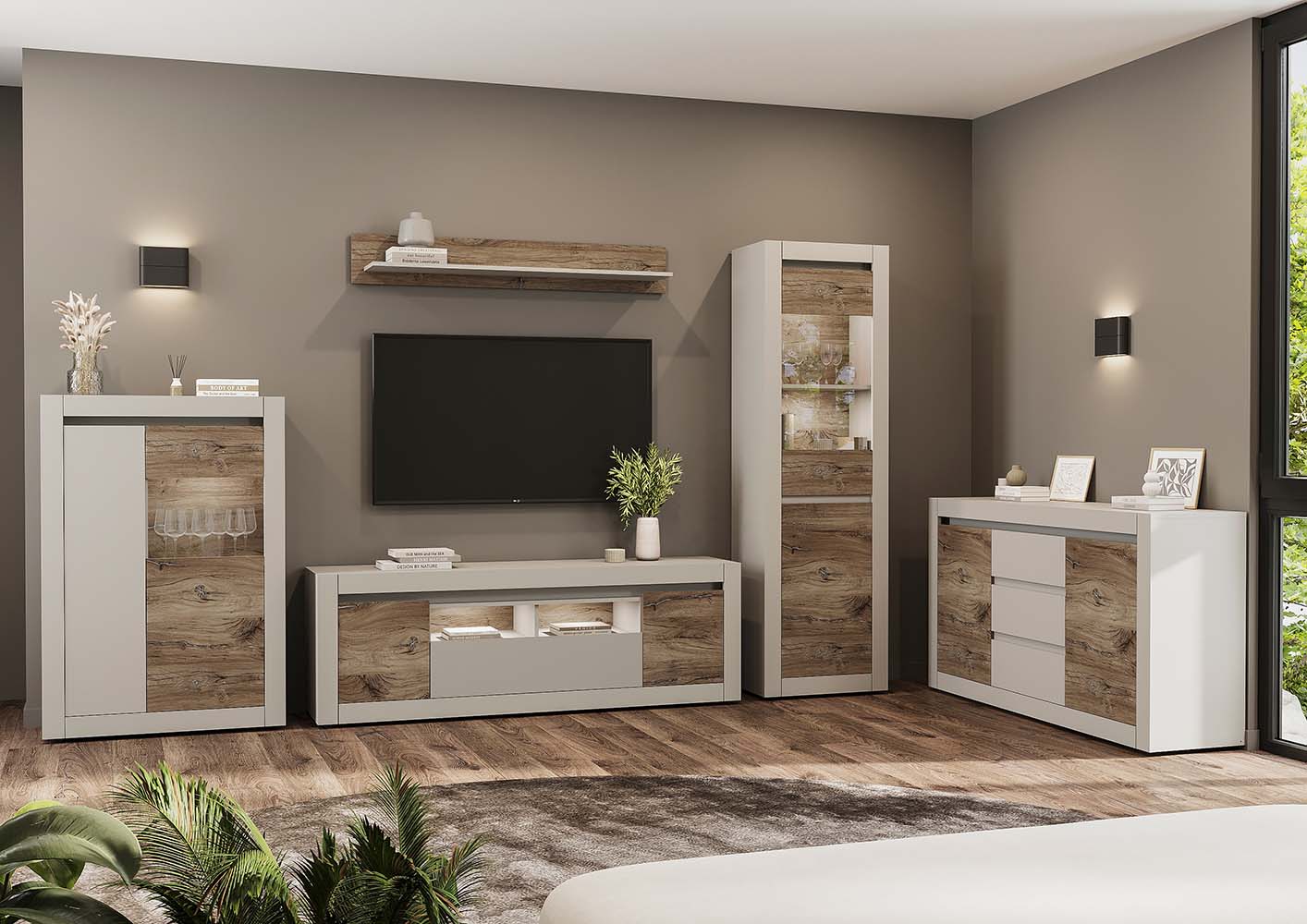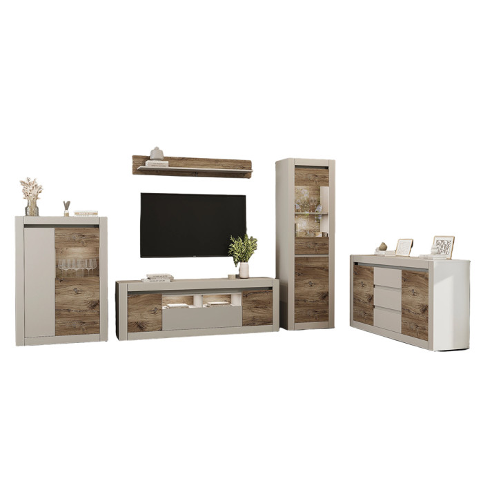 Модульная гостиная Сокме «Катания» сочетает современный стиль и функциональность. Комплект включает пять элементов: 2 пенала, комод, тумбу для ТВ и полку, которые создают уютную и практичную зону для отдыха. Сочетание текстуры натурального дерева со сдержанными фасадами добавляет интерьеру изысканности. Гостиная «Катания» идеально подходит для хранения вещей, декора и техники, обеспечивая комфорт и гармоничный вид вашего пространства.