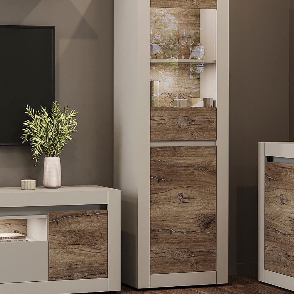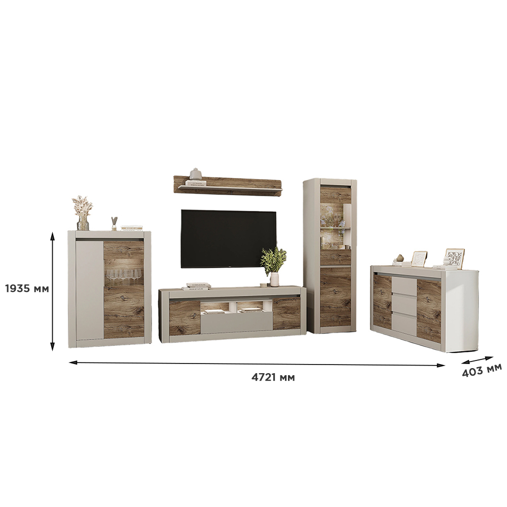 Корпус и фасады гостиной изготовлены из высококачественной ЛДСП с толщиной корпуса 16 мм и фасадов 16 и 18 мм. Благодаря текстуре, имитирующей натуральное дерево, мебель выглядит стильно и современно. Для дополнительной защиты от повреждений используется кромка АБС 0,5 мм и ПВХ 0,6 мм, что обеспечивает долговечность и устойчивость к износу.