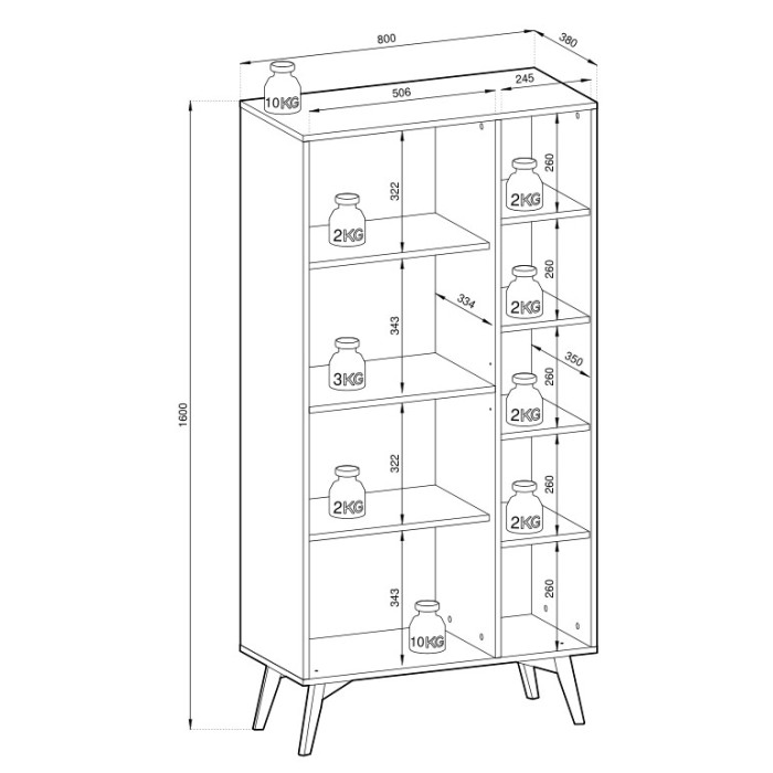 Стеллаж изготовлен из ЛДСП толщиной 16 мм, что обеспечивает прочность и долговечность конструкции. Ножки из лакированного дерева бежевого цвета придают лёгкость и устойчивость изделию. Фирменные петли обеспечивают надёжность дверей, а золотые металлические ручки добавляют элегантности и современного вида.
