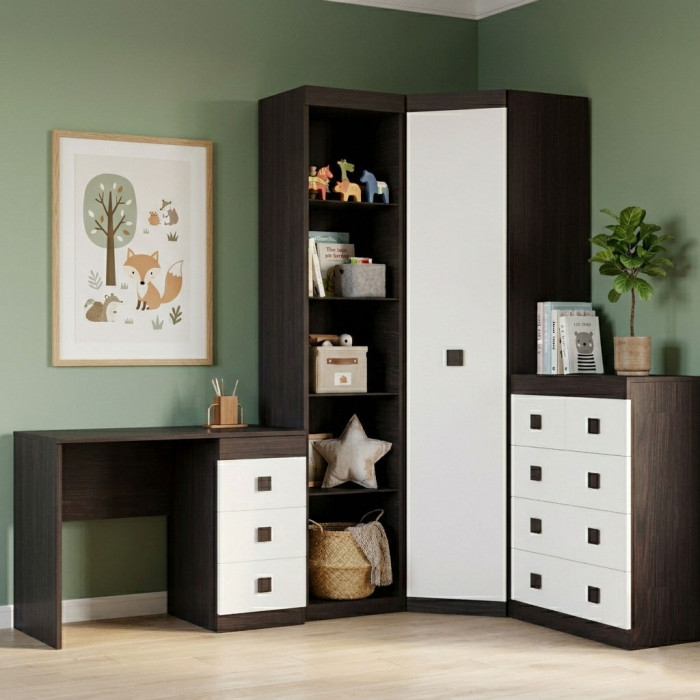 - Модульная система. Элементы комплекта можно размещать с учётом особенностей планировки комнаты, создавая индивидуальную конфигурацию.