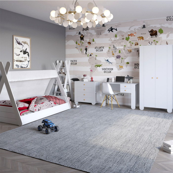 Гарнітур для дитячої спальної кімнати 5 елементів LION Інді Дитяча спальня LION Інді - це сучасний і практичний меблевий комплект, що ідеально підходить для облаштування дитячої кімнати. До набору входять п'ять елементів, які можна легко комбінувати залежно від ваших уподобань. Меблі виготовлені з міцного ламінованого ДСП, що забезпечує їхню зносостійкість та естетичний зовнішній вигляд. Мінімалістичний дизайн із чіткими лініями чудово поєднується з будь-яким інтер'єрним стилем. Комплект включає комфортне ліжко з балдахіном, комод на 4 шухляди, письмовий стіл, відкритий стелаж, а також дводверну розпашну шафу. Такий комплект забезпечує зручне зберігання, організацію робочого простору, затишок і комфорт. Матеріал виготовлення Гарнітур виготовлений із ЛДСП SWISS KRONO — високоякісного матеріалу, що відзначається міцністю, стійкістю до механічних пошкоджень, вологи та високих температур. Це гарантує довговічність меблів та їх привабливий зовнішній вигляд. Особливості Сучасний стиль: лаконічний дизайн підкреслює сучасну естетику приміщення. Місткість: кожен єлемент відкриває доступ до містких відділень, що зберігає простір організованим. Зручність: оптимальні розміри дозволяють розмістити меблі як у просторих, так і в компактних кімнатах. Надійність: використання якісного ЛДСП гарантує міцність і тривалий термін служби. Розміри: Комод: Ширина: 800 Глибина: 400 Висота: 755 Шафа: Ширина: 900 Глибина: 450 Висота: 1900 Ліжко: Ширина: 1970 Глибина: 1130 Висота: 1400 Стелаж: Ширина: 800 Глибина: 500 Висота: 750 Письмовий стіл: Ширина: 1100 Глибина: 500 Висота: 750