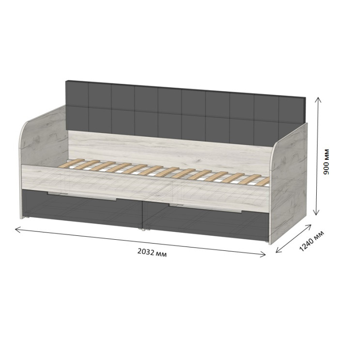 Детская полуторная кровать LION Л-7 с ящиками 90x200 см Кровать Л-7 это стильная и функциональная детская кровать, идеально подходящая для создания комфортной и уютной атмосферы в детской комнате. Модель изготовлена из высококачественных, экологически чистых материалов, что гарантирует долговечность, безопасность и устойчивость к износу. Основой кровати являются ламели, которые обеспечивают отличную вентиляцию матраса и дополнительную ортопедическую поддержку для комфортного сна.Практичные выдвижные ящики добавляют функциональности, предоставляя дополнительное место для хранения вещей. Видеообзор: Кровать LION Л-7 Материал изготовления Кровать изготовлена из ЛДСП SWISS KRONO – высококачественного материала, сочетающего эстетику с прочностью и надежностью. ЛДСП от SWISS KRONO известен своей стойкостью к механическим повреждениям, влаге и высоким температурам, что гарантирует долговечность мебели и сохраняет ее эстетичный вид на долгие годы. Ортопедические ламели Кровать комплектуется ламелями, обеспечивающими оптимальную поддержку матраса и правильное положение тела ребенка во время сна. Ламели способствуют вентиляции матраса, что повышает комфорт и обеспечивает здоровый отдых. Особенности: Выдвижные ящики. Кровать оснащена ящиками с телескопическими направляющими, позволяющими хранить книги, игрушки или постельное белье прямо под кроватью, сохраняя пространство в детской комнате. Мягкая спинка.Мягкая спинка кровати обеспечивает комфорт во время сидения, что позволяет ребенку удобно читать, смотреть телевизор или играть. Кромка 2 мм - защищает края изделий от повреждений, придает им эстетически завершенный вид и повышает долговечность мебели. Кромка изготавливается из прочных материалов, что позволяет ей выдерживать интенсивное использование и сохранять привлекательный внешний вид на протяжении многих лет. Видео-инструкция сборки: Кровать LION Л-7 Размеры: Спальное место: 90x200 см Ширина кровати: 2032 мм. Глубина: 940 мм Высота: 900 мм