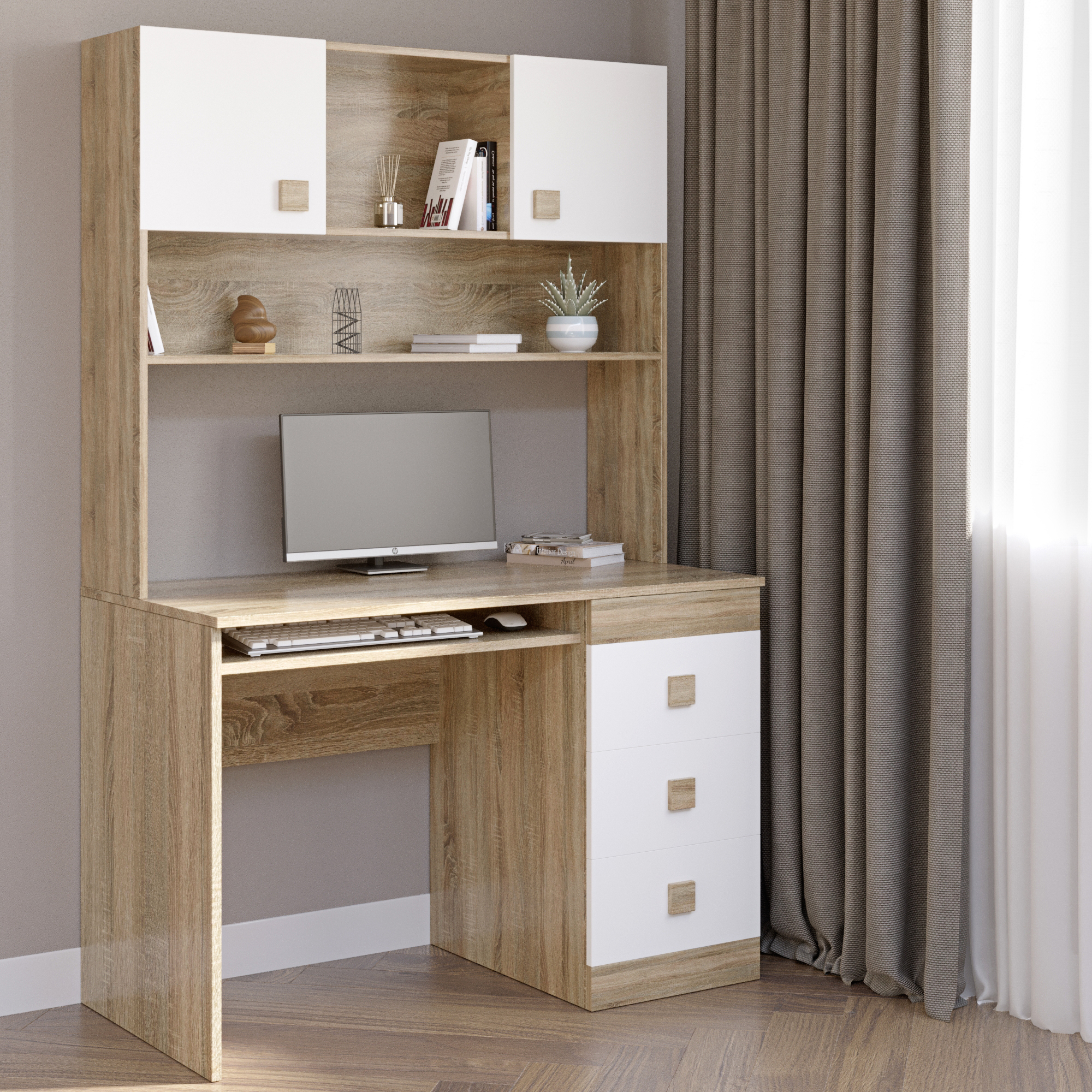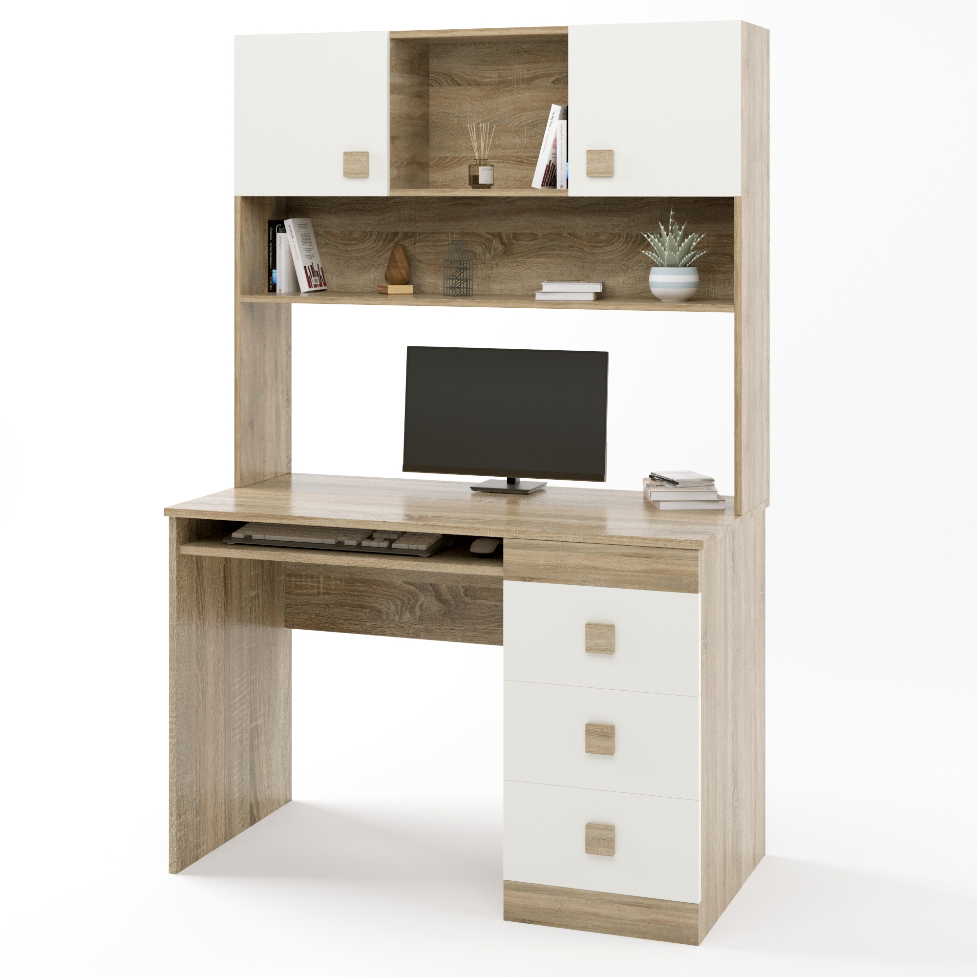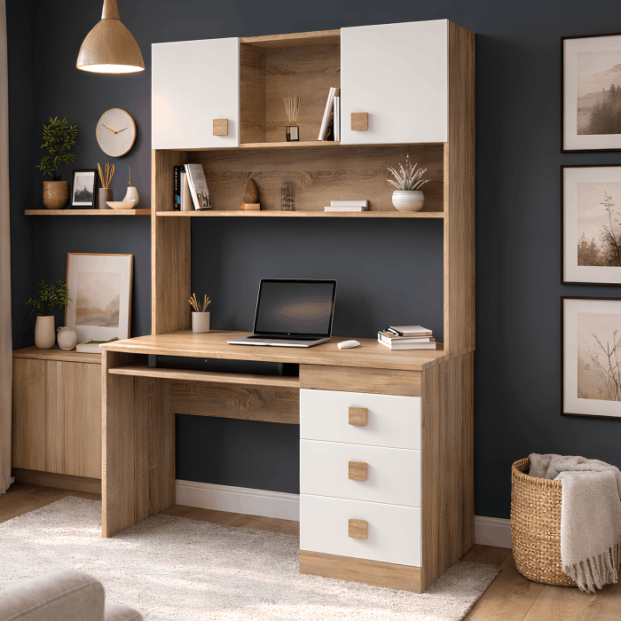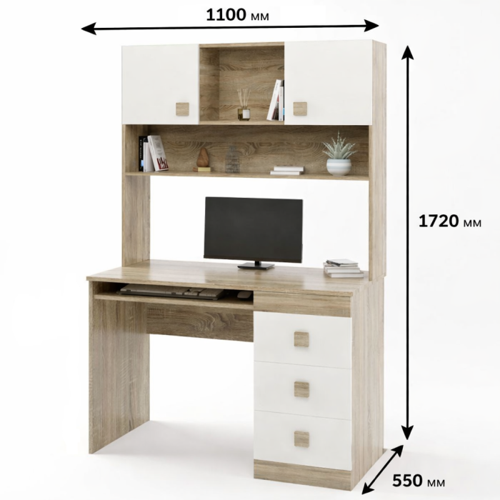 • Функциональное хранение. Стол оснащен верхней надстройкой с открытыми полками и двумя отделами с откидной дверцей. Три видвижных ящика предназначены для аккуратного хранения письменных принадлежностей, документов и личных вещей. В комплектацию входит удобная выдвижная полка для клавиатуры.