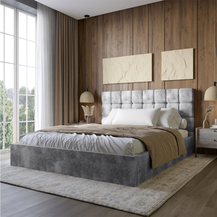 Двуспальная деревянная кровать LION Пикси со спальным местом 160х200 см Кровать Пикси от мебельной фабрики Lion - это стильное и удобное решение для спальни, которое гармонично впишется в любой интерьер. Благодаря использованию высококачественных материалов, она отличается прочностью и долговечностью. Основание из ламелей обеспечивает отличную вентиляцию матраса и дополнительную ортопедическую поддержку, создавая идеальные условия для комфортного сна. Кровать представлена в стандартном двуспальном размере, что обеспечивает достаточно места для отдыха, а ее надежная конструкция выдерживает значительные нагрузки. Материал изготовления Кровать изготовлена из ЛДСП SWISS KRONO - высококачественного материала, сочетающего эстетику с прочностью и надежностью. ЛДСП от SWISS KRONO известен своей устойчивостью к механическим повреждениям, влаге и высоким температурам, что гарантирует долговечность мебели и сохраняет ее эстетический вид на долгие годы. Ортопедические ламели Кровать комплектуется ортопедическими ламелями, обеспечивающими оптимальную поддержку матраса и правильное положение тела во время сна. Ламели способствуют вентиляции матраса, что повышает комфорт и обеспечивает здоровый отдых. Они равномерно распределяют нагрузку, продлевая срок службы матраса. Кроме того, ламели предотвращают накопление влаги, что способствует созданию благоприятного микроклимата для сна. Каркас кровати «Пикси» можно заказать в другой цветовой палитре Матеріал обивки - SILK: Мебельная ткань SILK - это изысканная коллекция велюрового обивочного материала, представленная в разнообразной палитре оттенков. Она сочетает в себе элегантный внешний вид и приятную на ощупь текстуру, что делает ее идеальным выбором для создания уютной и стильной атмосферы в интерьере. Ткань отличается высокой износостойкостью, что обеспечивает ее долговечность даже при интенсивном использовании. Благодаря универсальности оттенков, коллекция SILK легко впишется как в классический, так и в современный дизайн. Кроме этого, материал устойчив к выгоранию, что позволяет сохранить насыщенность цвета в течение длительного времени. Характеристики: Каркас: Ламинированное ДСП Спальное место: 160x200 см Высота изголовья (мм): 1050 Ширина (мм): 1720 Длина (мм): 2130 Цвет обивки: Silk 303 (Серый) Основание под матрас: ортопедические ламели
