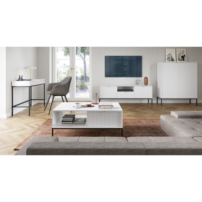 Габариты стола - 104x68x46 см - обеспечивают достаточно рабочей площади для удобного использования, при этом сохраняя легкость конструкции. Белый цвет с рифлеными акцентами и черными металлическими ножками создает выразительный, но не навязчивый вид. Золотистая ручка добавляет нотки элегантности.