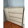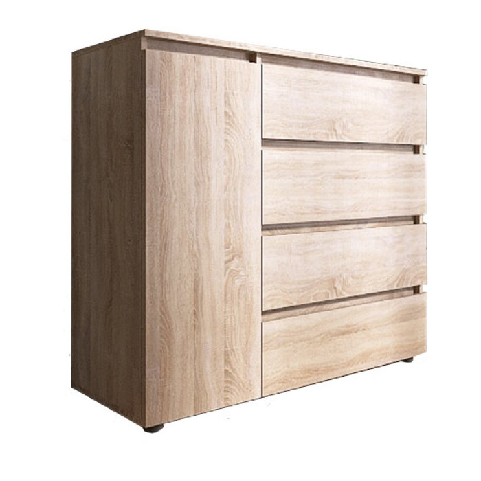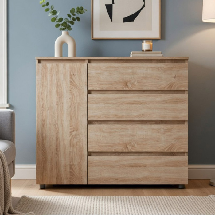 Продуманная конструкция сочетает вместительные выдвижные ящики и дополнительное закрытое отделение с полкой, что делает комод универсальным для хранения вещей разного типа.