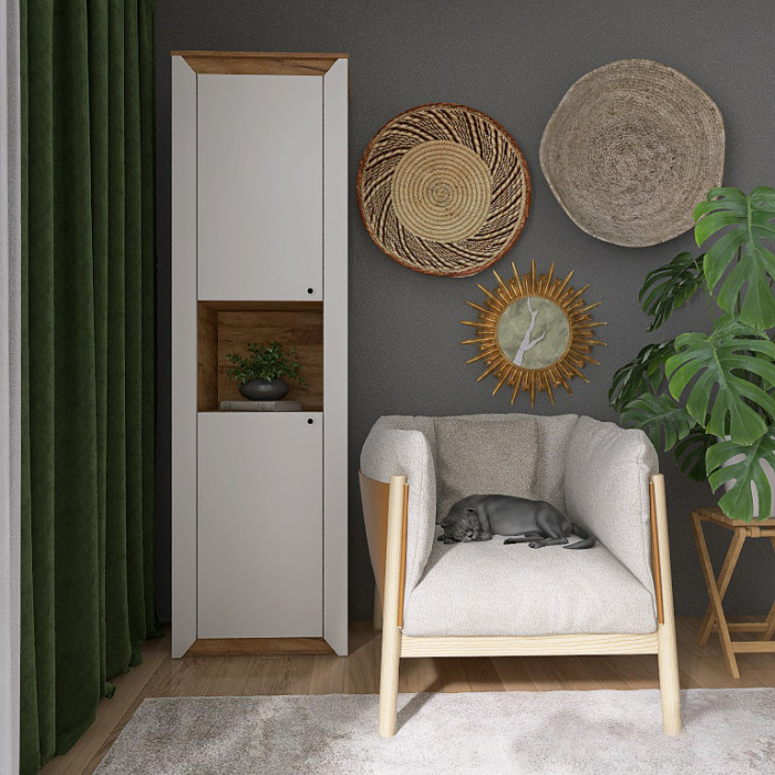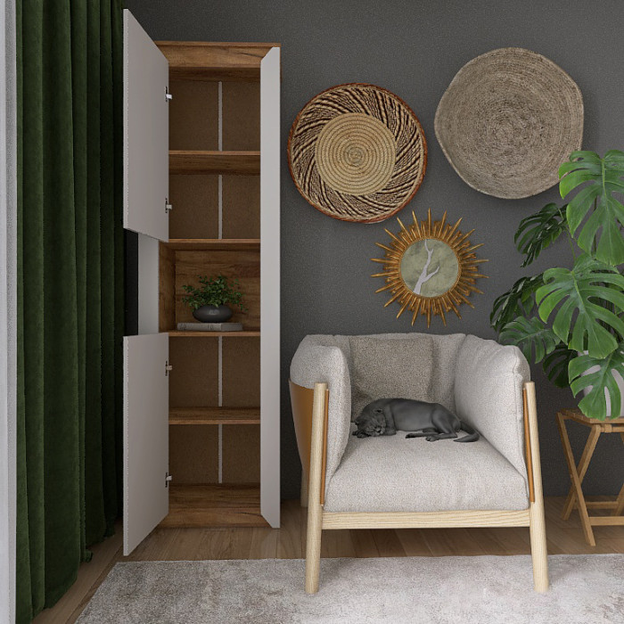 - Удобство хранения: Два закрытых отсека за дверцами обеспечивают конфиденциальное хранение, а открытая полка в центре предоставляет пространство для декора и легко доступных предметов.