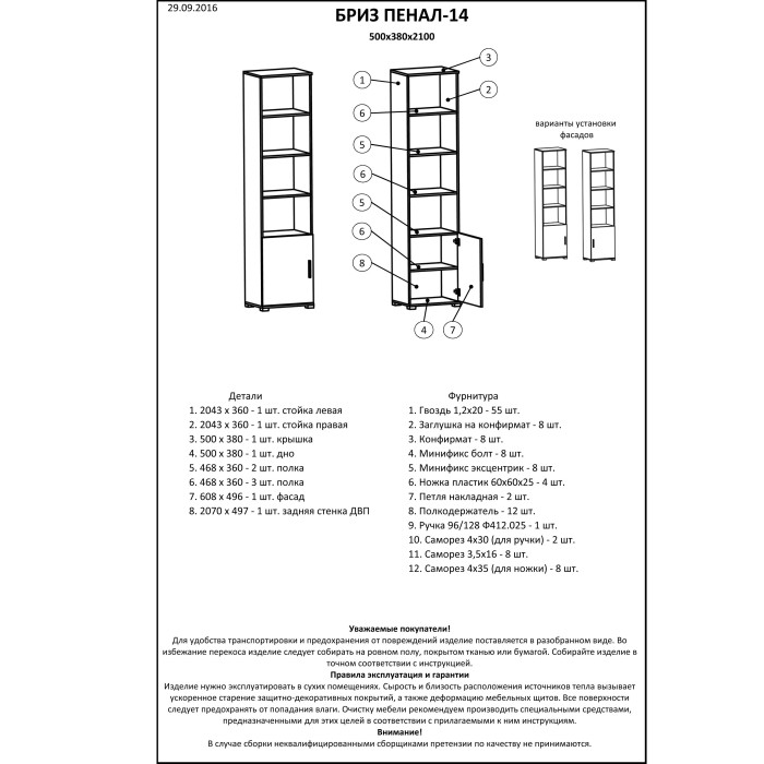 Элемент модульной системы Бриз — открытый пенал с дверцей — изготовлен из ламинированного ДСП толщиной 16 мм. Материал отличается прочностью, устойчивостью к повседневной эксплуатации и простотой в уходе. Торцы деталей обработаны кромкой ПВХ толщиной 0,5 мм, что защищает их от механических повреждений и увеличивает срок службы мебели. Корпус выполнен из экологически чистого ЛДСП класса эмиссии Е1 производства Kronospan, поэтому изделие безопасно для использования даже в детской комнате. Современная цветовая комбинация позволяет легко интегрировать пенал в любой интерьер.