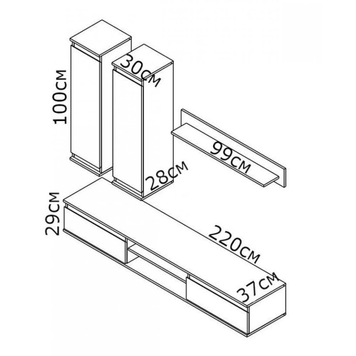 • Тумба под TV: Длина - 220 см, Глубина - 37 см, Высота - 29 см;